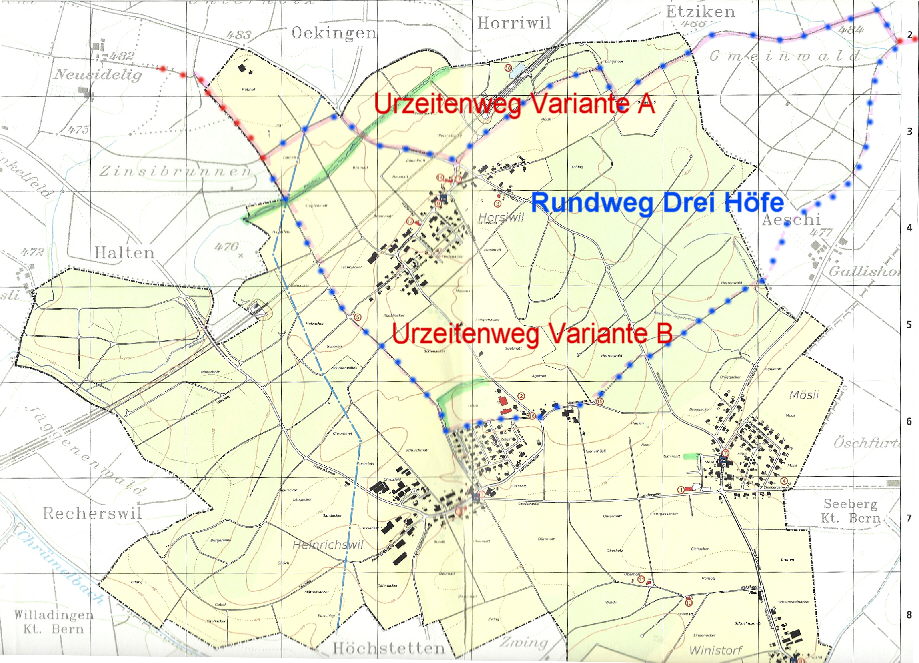 Oberer Ast Variante A des Urzeitenweges: Vor Hersiwil von der Oekingenstrasse links abbiegen in Richtung Winistorf, dann nach ca. 200m geradeaus weiter auf den Weg zum Tunnelportal der Bahn 2000 fahren. Auf diesem Weg am Waldrand entlang und kurz in den Wald hinein fahren. Im Wald nach rechts und dann bei der Waldecke wieder scharf nach links auf die Aeschistrasse abbiegen. Auf dieser am Waldrand und dann im Wald entlang dem Dornackerbächli in Richtung Aeschi. Der Weg wird vor Aeschi zum Hersiwilerweg, vor diesem beim Waldausgang rechts abbiegen. Bei der Wakdecke rechts in die Variante 11B einbiegen.